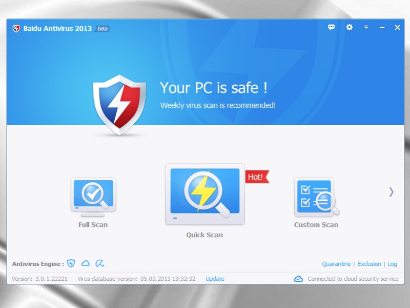 Baidu antivirus download 2018. Baidu Antivirus Download (2023 Latest) - FileHorse Baidu Antivirus is a fully free antivirus protection software that utilizes all the advances of modern cloud computation to deliver rock-solid protection to all users. This entails protection against foreign threats, interception of harmful software packages, and constant protection of your local OS and data. Baidu Antivirus 2015 - Free download and software reviews - CNET Download Baidu Antivirus is a permanently free and easy-to-use cloud security solution with a built-in cloud engine, USB protection, download protection, browser protection, and many more professional... Baidu antivirus 2018 free download (Windows) Baidu antivirus 2018 free download Most people looking for Baidu antivirus 2018 free downloaded: Baidu Antivirus Download 4.4 on 593 votes Baidu Antivirus is a permanently free and easy-to-use cloud security solution with a built-in cloud engine ... Similar choice › Baidu antivirus for win XP 32 bit › Baidu antivirus for pc Baidu Antivirus 5.4.3.148966 Download | TechSpot Downloads Security Antivirus Baidu Antivirus 5.4.3.148966 Baidu Antivirus is a ultra light weight, easy to use, extremely fast anti-virus program that protects your system from malware,...